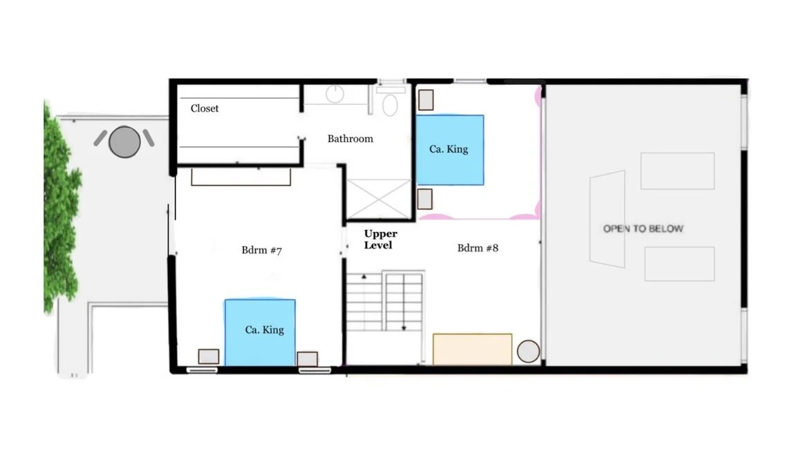 Seven private bedrooms, plus loft sleeping area (8 total rooms) and 3 full baths. Our total bed count is 11, which includes 3 kind, 3 queen, 3 full, and 1 Twin XL. Twin fold-a-way beds upon request. More photos to come.