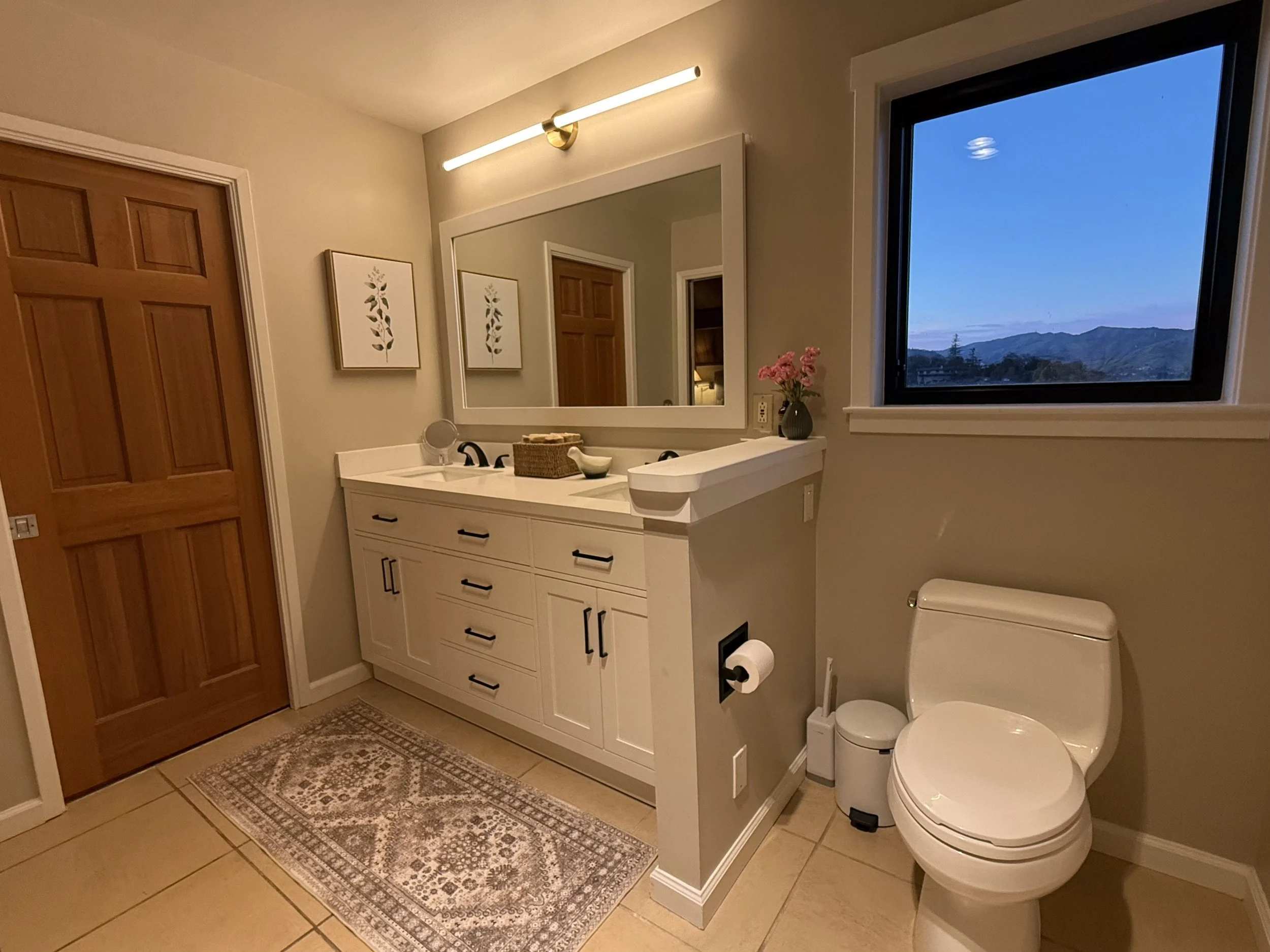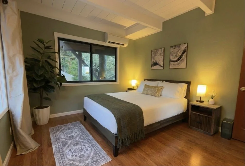 An open and warm floor plan featuring Redwood beams and a vaulted ceiling in the comfortable main room puts you on vacation feel. Open wide views of Marin’s Lucas Valley mountains and end of SF Bay greet you throughout the home. Groups can enjoy convening in the main floor near the fireplace while skylights (featured throughout the home) filter in natural light – Catch-up, retreat, and relax with others on the view-filled patios. Guests will feel restful in cozy, clean, and comfortable bedrooms, sleeping up to 20 comfortably. There’s plenty of space for big groups to be together or break-a-way for smaller activities. Come stay, be together, and be inspired, natural surroundings and views surround you. Come stay at Marin Vista Retreat house for your next Marin stay.